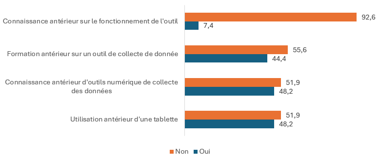 – Formation antérieure sur un outil de collecte de données : Moins de la moitié (44,4 %) avaient bénéficié d’une formation préalable dans ce domaine, montrant une lacune à combler pour favoriser une appropriation fluide.