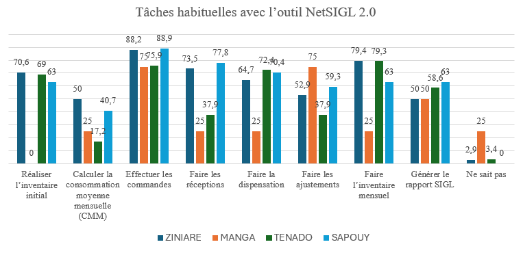La génération du rapport NetSIGL est bien assurée à Ziniaré (63 %), mais plus faible à Manga et Ténado (50 %), traduisant une marge d’amélioration possible. À noter également que certains utilisateurs, notamment à Manga (25 %) et Ténado (3,4 %), déclarent ne pas savoir s’ils effectuent certaines tâches.