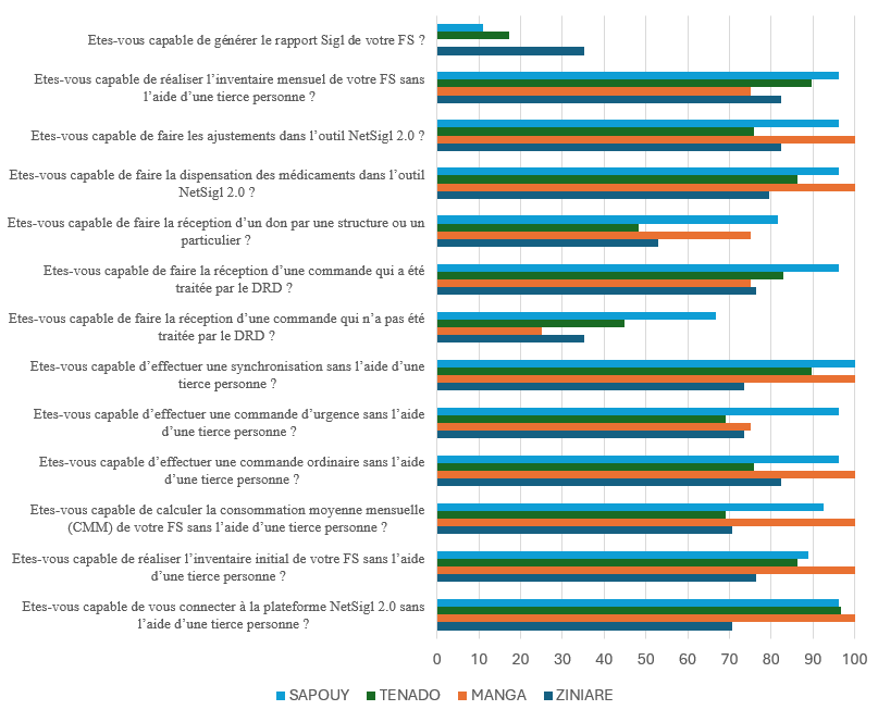 – À Sapouy, les utilisateurs sont très autonomes sur les tâches courantes, mais des lacunes apparaissent sur des fonctionnalités plus techniques comme la réception des commandes non traitées ou la génération du rapport SIGL, où les taux sont significativement plus faibles.