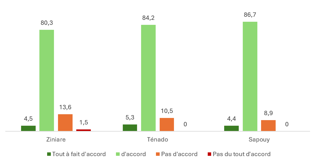 Les réponses « Tout à fait d’accord » restent minoritaires dans les trois districts, comprises entre 4,4 % et 5,3 %, traduisant une reconnaissance encore partielle d’une pleine maîtrise. Les niveaux d’insatisfaction sont globalement faibles, mais non négligeables à Ziniaré (13,6 %) et Ténado (10,5 %), contre seulement 8,9 % à Sapouy. Le désaccord total (« pas du tout d’accord ») n’est exprimé que par 1,5 % des utilisateurs à Ziniaré, et reste inexistant ailleurs.